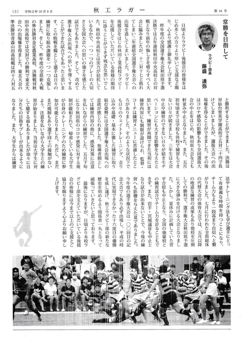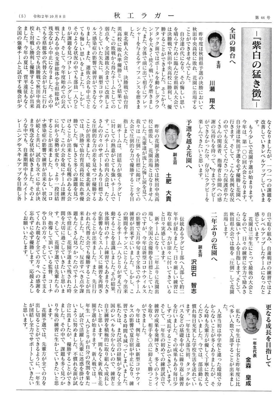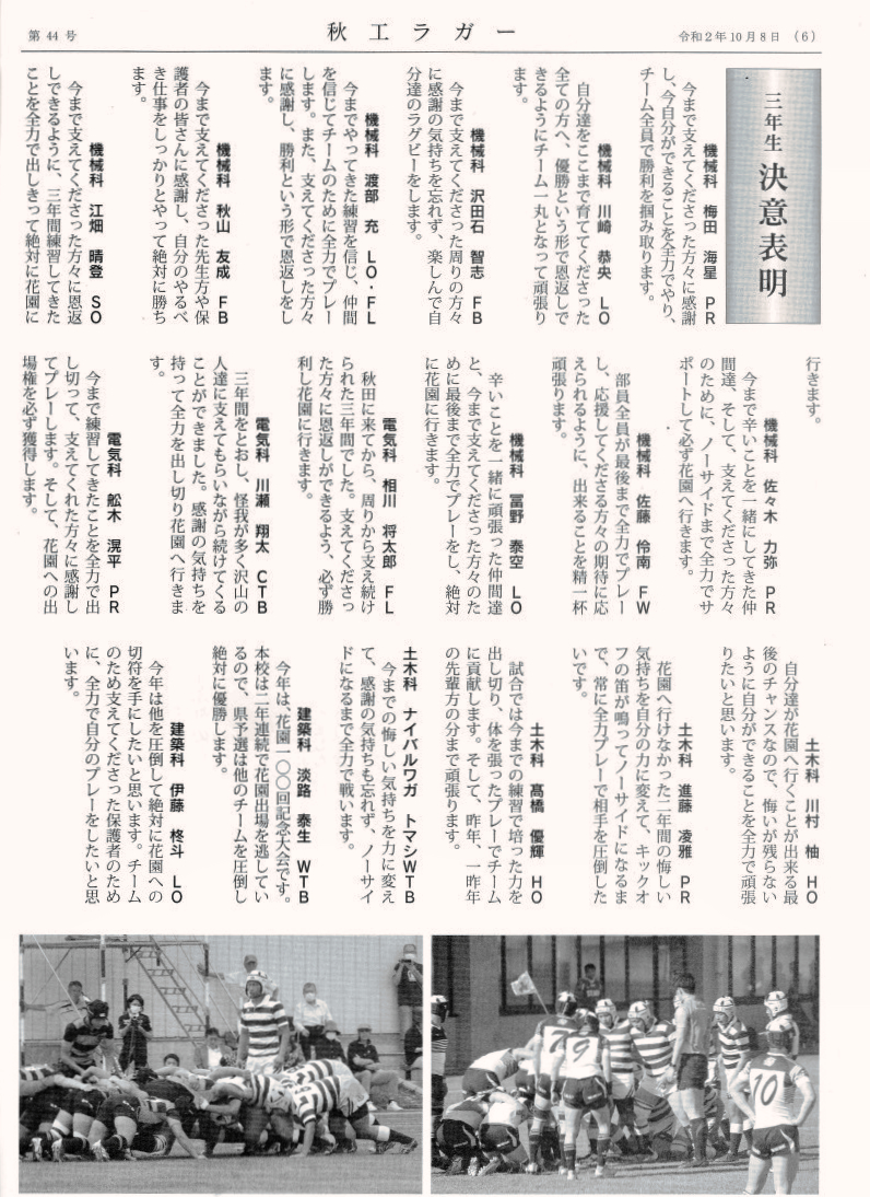 秋田県大会優勝を目指して、又大阪花園全国大会16度目の優勝を目標に淡路監督、藤森部長、黒澤校長、ラクビー部員の1人1人の決意表明が記載されている。