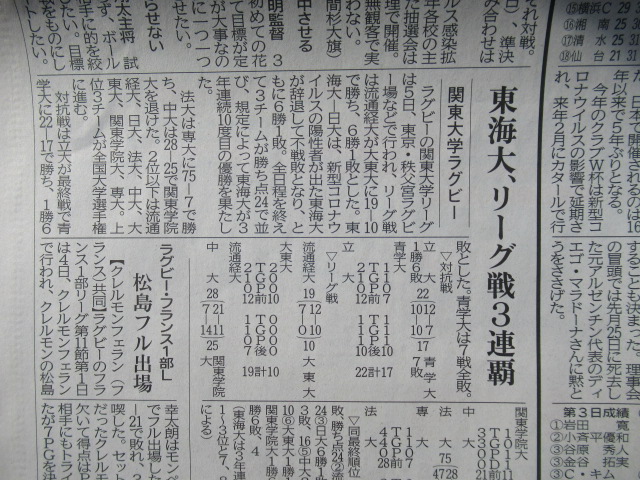 ラグビーの関東大学リーグは12月5日、東京・秩父宮ラグビー場などで行われ、リーグ戦は流通経大が大東大に19―10で勝ち、 6勝1敗とした。