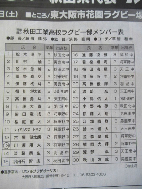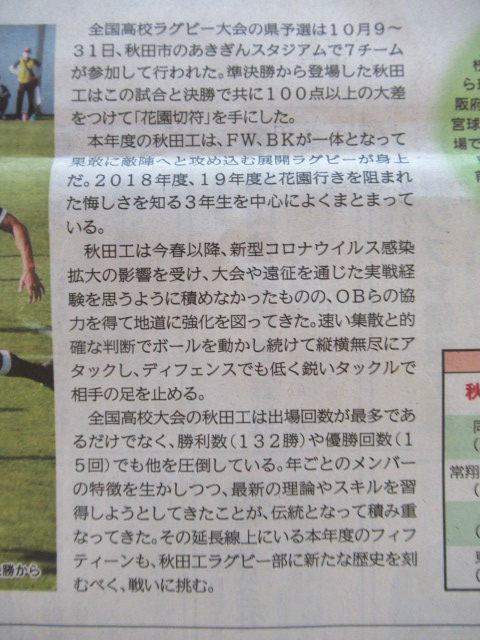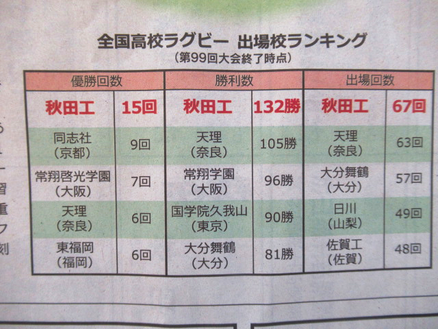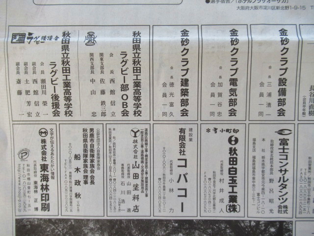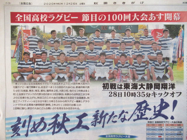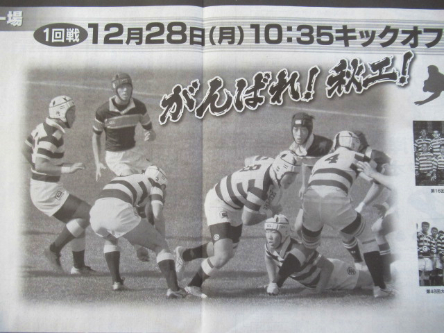 全国高校ラグビー大会節目の第100回大会は本日27日(日)から始まった。 26日(土)のさきがけ新聞の全面広告に秋工関係者の応援・協賛がのりましたので 紹介させていただきます。