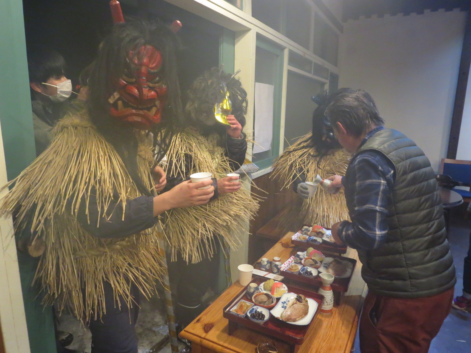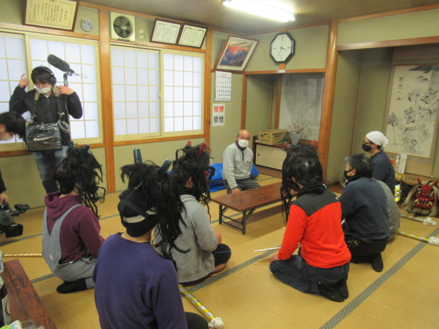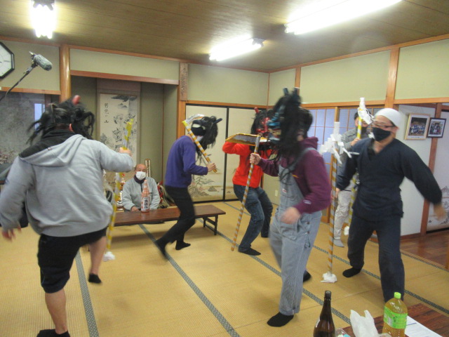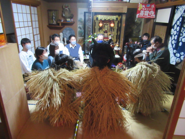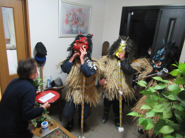 元男鹿市地域おこし協力隊員 伊藤春樹さん(増川地区に移住)などの協力を得て外部からの “助っ人”を招き、12年ぶりに行事を行って(2018年)から3年目を迎えた。 集まったのは伊藤春樹さんがソーシャル・ネットワーキング・(SNS)での呼びかけに応じた今回は秋田市内の若者でした。 行事本番の31日午後2時に地区会館に集合、約1時間ナマハゲの心得伝授後、4時30分から出発して、約20軒の家々を回った。 地区の高齢者・若者とともに、国際教養大学、秋田大学、秋田県立大学で学ぶ学生他が角や牙を生やした 異形の面をかぶって家々を回り、無病息災や豊作、豊漁などを祈った。