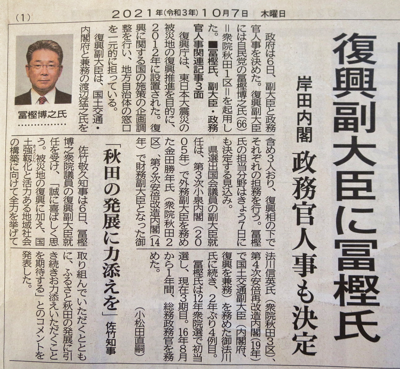 復興副大臣に就任した自民党の冨樫博之氏(66)=衆院秋田1区=が6日、東京・永田町の
