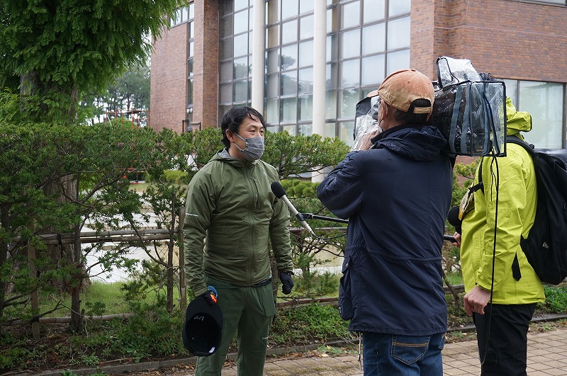 大野に集中する報道陣(秋工陸上競技部OB会提供)