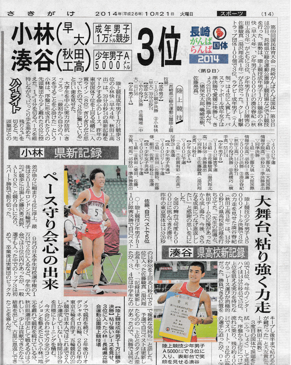 第69回国民体育大会「長崎がんばらんば国体」第9日は20日、長崎県立総合運動公園陸上競技場などで17競技を行った。 秋田県勢は、陸上競技成年男子1万メートル競歩の小林快(早大4年…秋工出)、少年男子A5000メートルの湊谷春紀(秋田工高3年)がともに全国3位、少年男子B110メートル障害の佐藤駿真(湯沢翔北高1年)が5位だった。