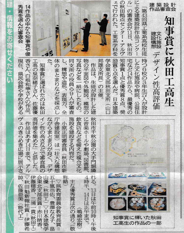 「最優秀の知事賞に秋工生(日本建築学会東北支部建築設計作品審査会)」を紹介させていただきます。