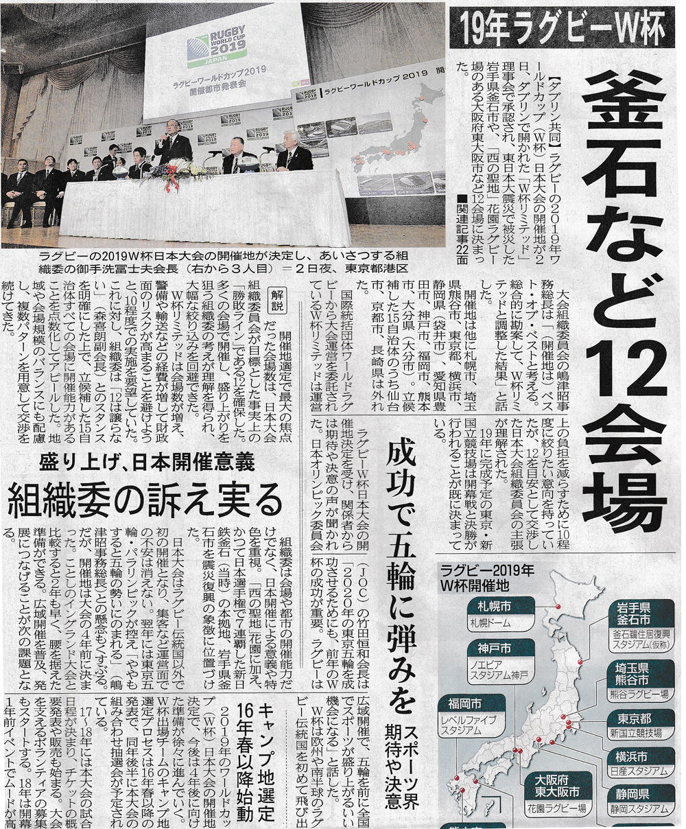 ラグビーワールドカップ2019 開催地決定! 釜石など12会場(日本ラクビー協会) (秋田さきがけ270303)