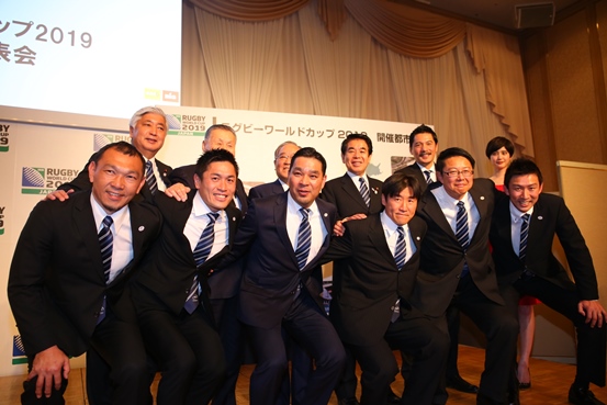 ラグビーワールドカップ2019 開催地決定! 釜石など12都市前列左から、アンバサダーの元木氏、大畑氏、増保氏、松田氏、桜庭氏(秋工出)、田沼氏...