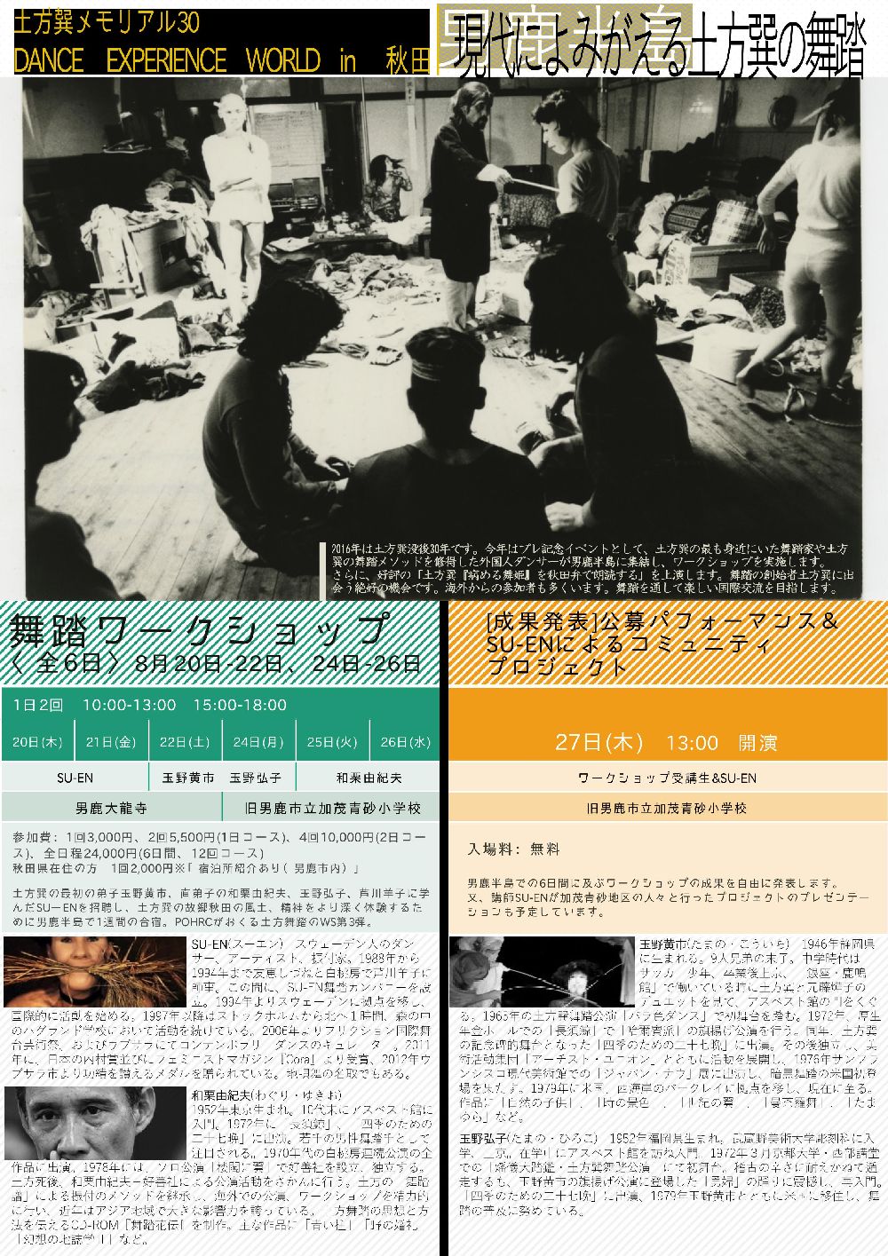 今年はプレ記念イベントとして、土方巽の最も身近にいた舞踏家や土方巽の舞踏メソッドを修得した外国人ダンサーが男鹿半島に集結し、ワークショップを実施します。