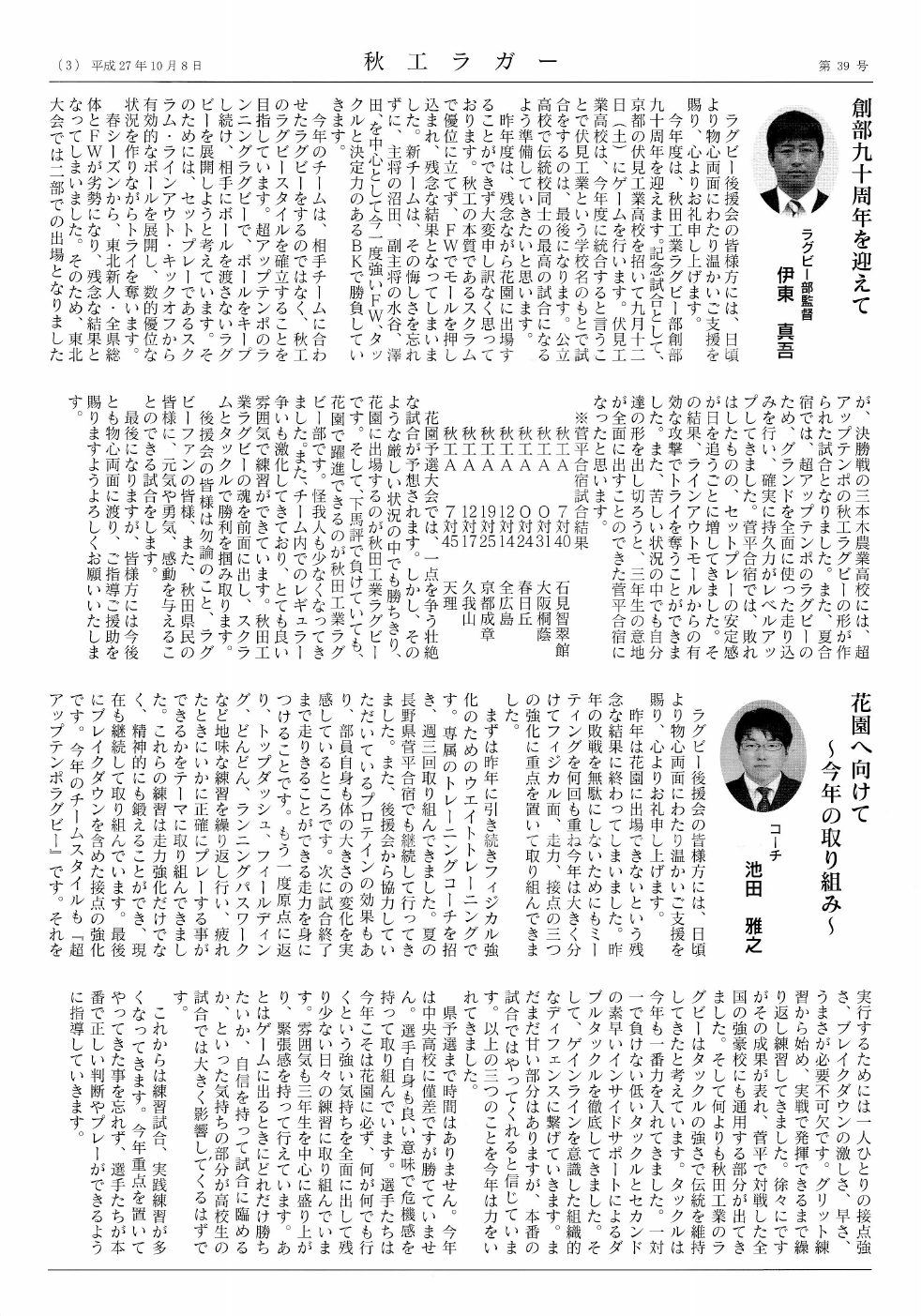伊東監督:秋工ラクビー部の魂を全面に出し、スクラムとタックルで勝利を掴み取ります。