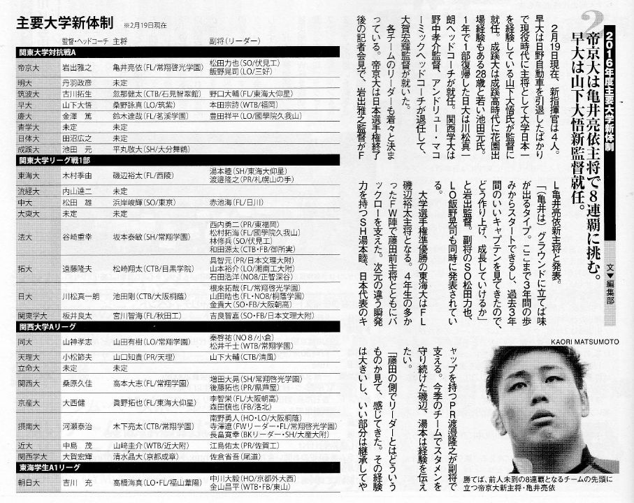 「2016年度主要大学新体制(成田秀平明治大副将、宮川智海関東学院大主将)」を紹介させていただきます。