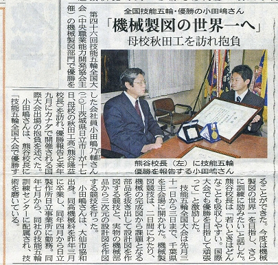 日立製作所 日立事業所勤務 小田嶋 乃輔(平成19年機械科卒)第46回技能五輪全国大会(中央職業能力開発協会主催)の機械製図部門で優勝した会社員小田嶋乃輔(だいすけ)さん(20)が2008年11月17日、母校を訪れ、優勝報告と来年9月にカナダで開催される国際大会出場の抱負を述べました。若い力が頼もしく育って行くことを陰ながら応援したいと思います。