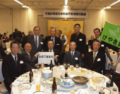 首都圏在住の秋田市出身者などが一堂に会した場で、秋田市の現状に関する情報を提供すると同時に、種々の意見交換を行い、秋田市政への理解を深めてもらうとともに、ふるさと秋田の強力なサポーターとして、首都圏における秋田市のPR活動等を担ってもらうことを主旨に開催される。 11月7日(金)、東京グリーンパレスにて、秋田市長、各関係省庁、秋田市関連企業のお客様、そしてけやき会所属会員など150名余りのご出席のもと開催された。第一部として市長から市政報告、19年度にスタートした第11次秋田市総合計画のもと、「産業経済の振興」「家族・地域のきずなづくり」の具体的な施策説明があった。また平成21年の秋田市制施行120周年を迎えるに当たり「きずな」をメインテーマに様々な記念事業を企画中であるとの報告がなされました。第二部は来賓のごあいさつがあり、また懇親会に入り、それぞれのテーブルでの情報交換、意見交流が行われ大いに盛り上がりました。 | |||||||