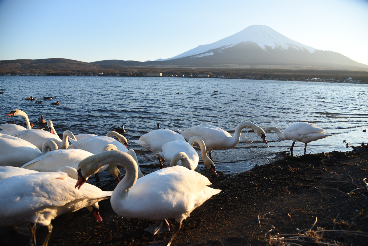 4月15日上野原のゴルフ帰り天気が良かったので河口湖に富士山と桜の写真撮りました。山中湖に足を延して白鳥と鴨が夕陽を浴びて仲良く食事していた写真撮りました。