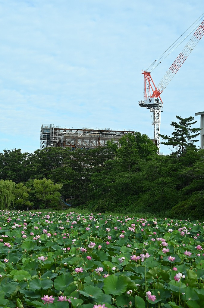 30日午前中に千秋公園大手門入り口の蓮の花が満開で咲き誇って8月いっぱい楽しめるようです。夜10時までライトアップされて、幻想的なハスの写真を撮ってきました。秋田県立芸術館の工事が急ピッチに進んでました。素晴らしい建物になる事でしょう。
