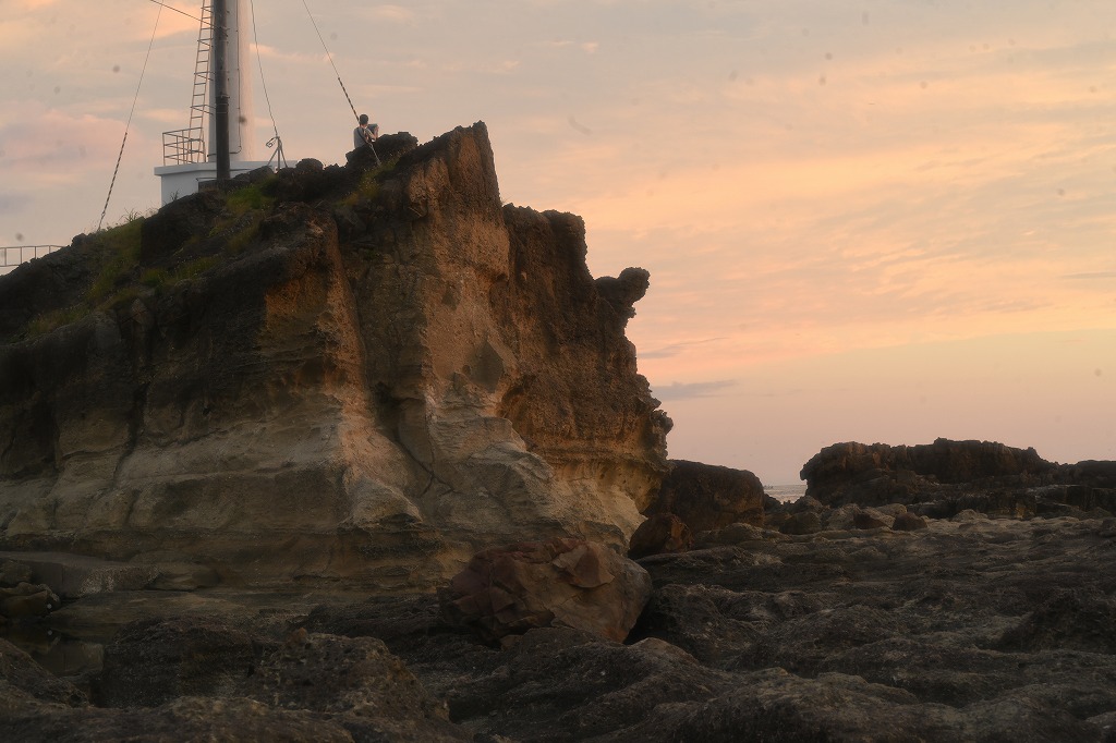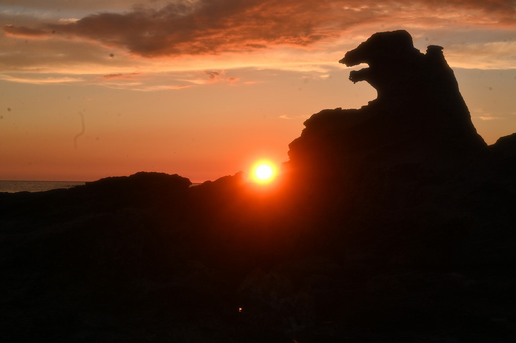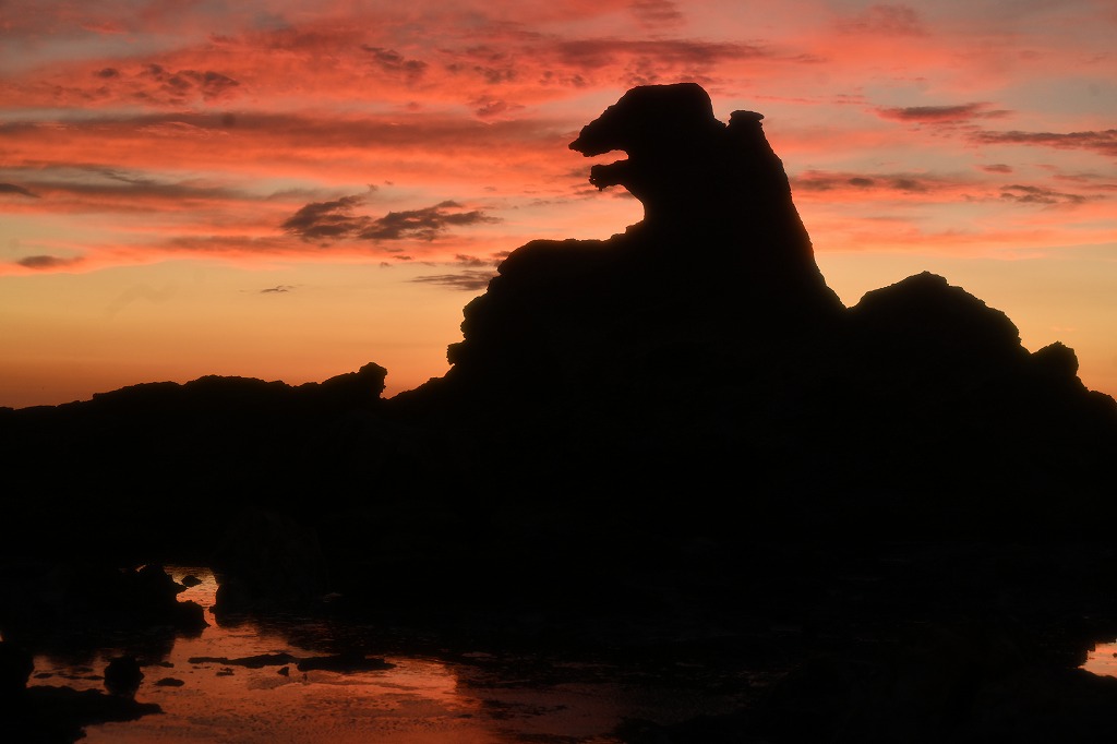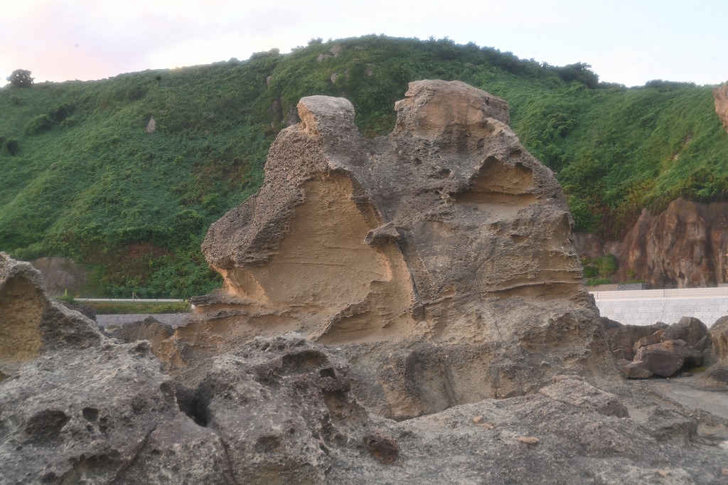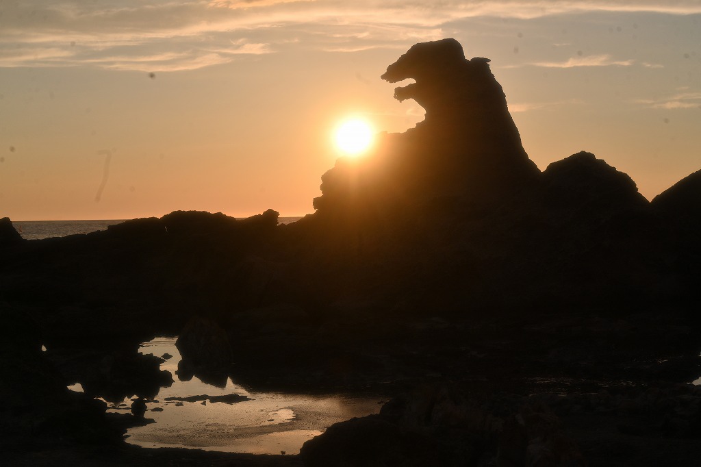 31日に同級生三人で夕方男鹿潮瀬崎の先端にある、怪獣・ゴジラ岩を観光して、夕日の写真を撮る事が出来ました。ゴジラ岩など地面より上にある岩は火山の噴火によって作られた火山礫擬溶岩であり、溶岩が固まってできたスポンジのような穴があるのが特徴でゴジラ岩も迫力があるが巨大岩もまた迫力があり、噴火によって作られた自然の破壊力に驚きました。