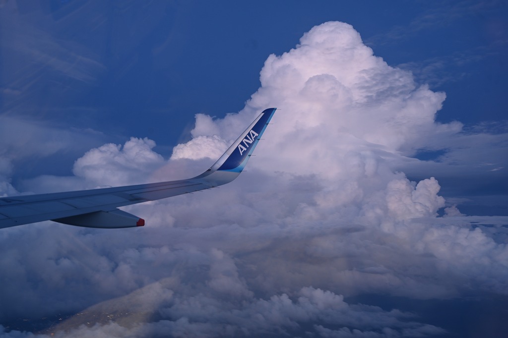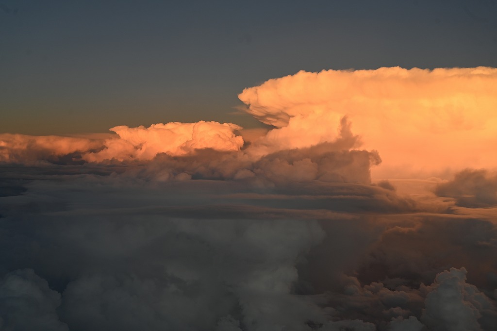 29日7時10分に秋田空港着の予定でしたが、着陸する上空に雷雲が発生して、過ぎ去るまで約40分日本海上空をぐるぐる旋回している間、夕日を浴びた雲と身近に迫力ある雷雲を写真に撮る事が出来ました。
