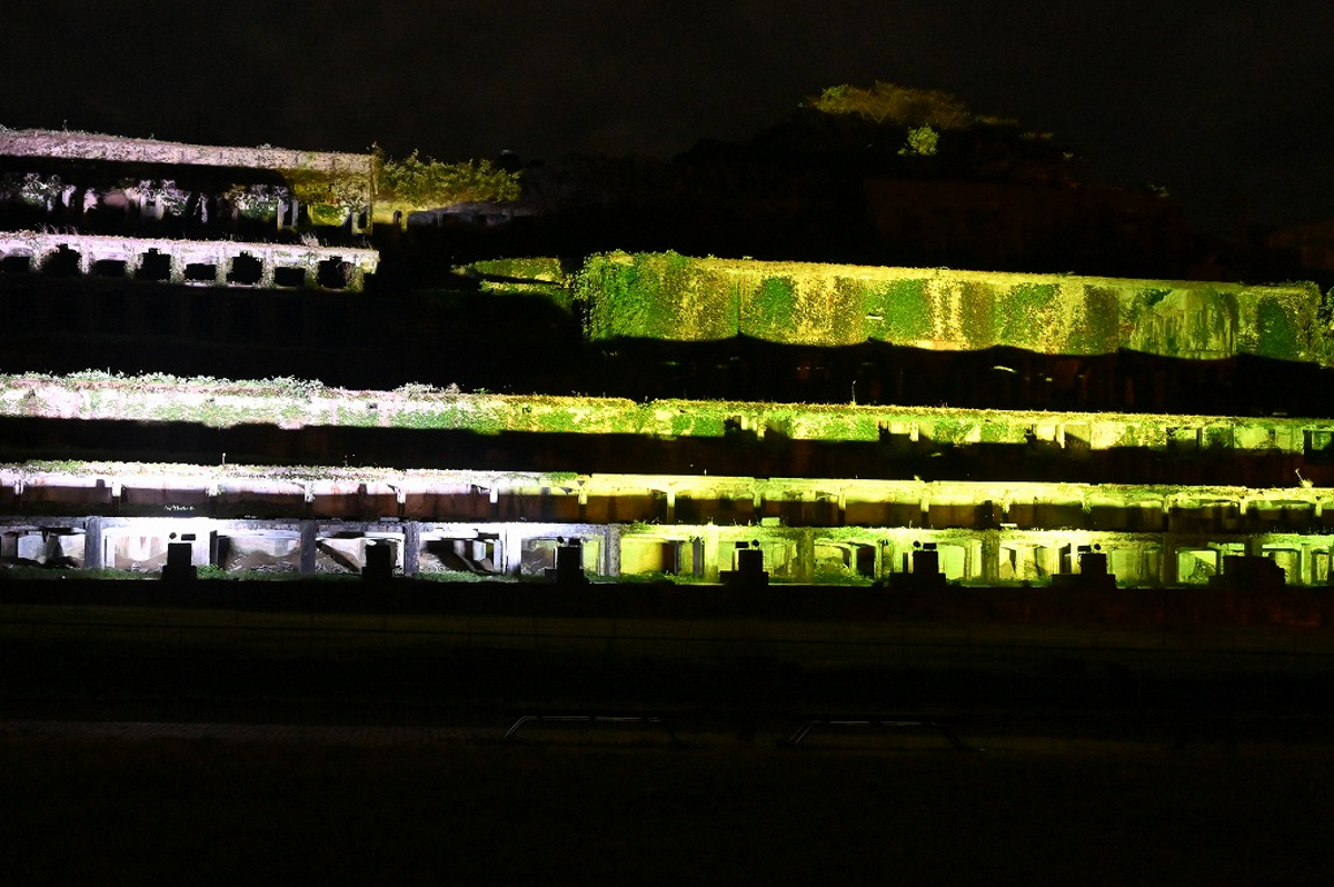 夫婦岩・猫岩を見学した⑦相川温泉・佐渡リゾートホテル吾妻(夕日に一番近い宿で低層でこじんまりとした落ち着いたホテルでした。夕日は雲に隠れて残念でした。海鮮料理・地酒がとても美味しかったです。)ホテルのバスで夜に北沢浮遊選鉱場後に連れていってもらい、いろいろな色がライトアップされて、幻想的な雰囲気でした。