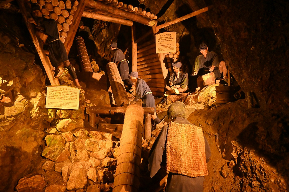 佐渡金山の坑道跡に掘削作業の再現、道遊抗コースを約一時間見学した。金脈を追い求めて、堀進めた坑道の総延長は約400km佐渡~東京間に達する。徳川幕府の財政を支えた。