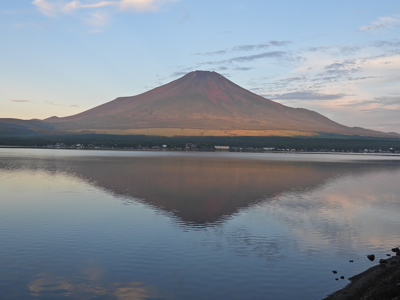 28日早朝4時頃、雲と霧で富士山が見えなくてパノラマ台を諦め、念のため長池湖畔の親水公園に4時40分に着いたら富士山がクッキリ見えました。慌ててカメラを2台セットして4時50分~5時の10分間赤富士の撮影ができて、感激しました。ラッキーでした。その後雲に隠れてしまいました。