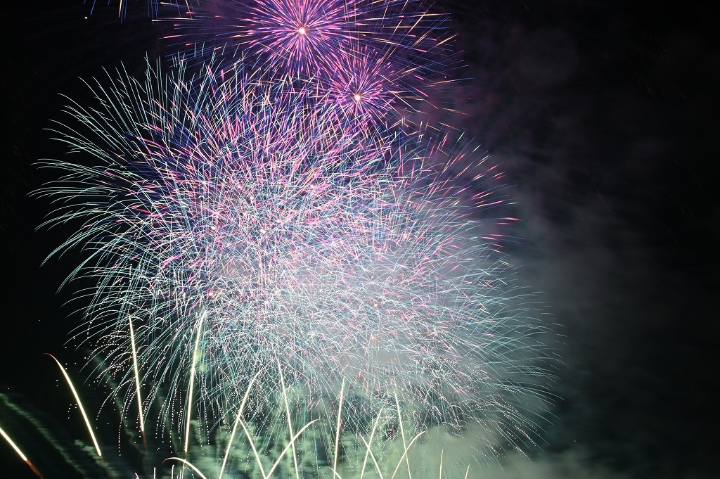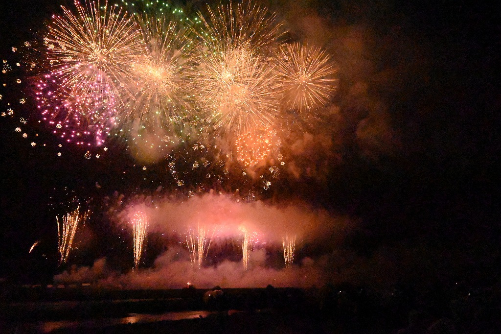 当日の秋田駅は花火に行く客で今まで見たことない人でごった返してました。秋田駅東口14時に大型バス40名と添乗員1名で出発。天気予報は夜9時頃から雨の予報でしたが、花火開始頃から雨が降り始め終わりまで大雨でした。雨合羽を着たが、ずぶずぶに濡れました。夜花火は大曲農業高校創立130周年記念花火の打ち上げでスタートしました。県内外の花火師28社が1万8千発を打ち上げました。音楽に会う繊細な表現に心を奪われ雨の中花火が上がるたびに歓声が湧きました。