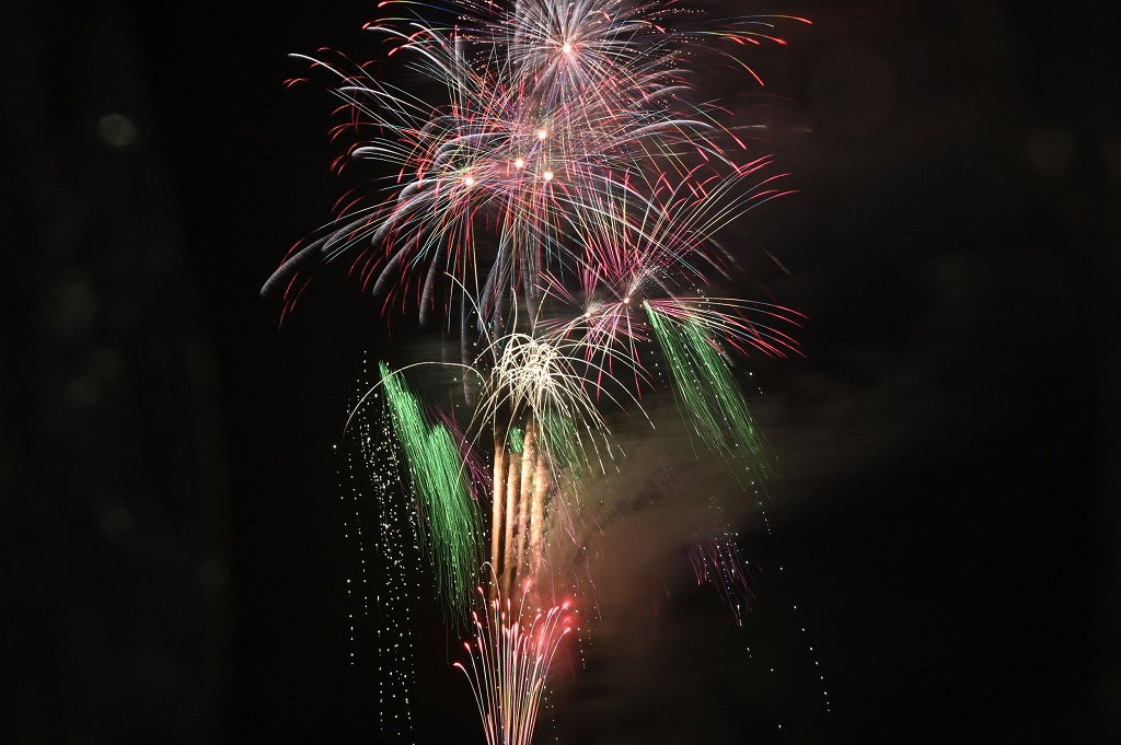 我々は打ち上げの比較的前列のパイプ椅子でしたので、打ち上げの音が頭にずんずん響き迫力満点でした。昼花火は空が曇って風もなく、花火の煙が流れなないため花火の色がくすんで見えて少し残念でした。
