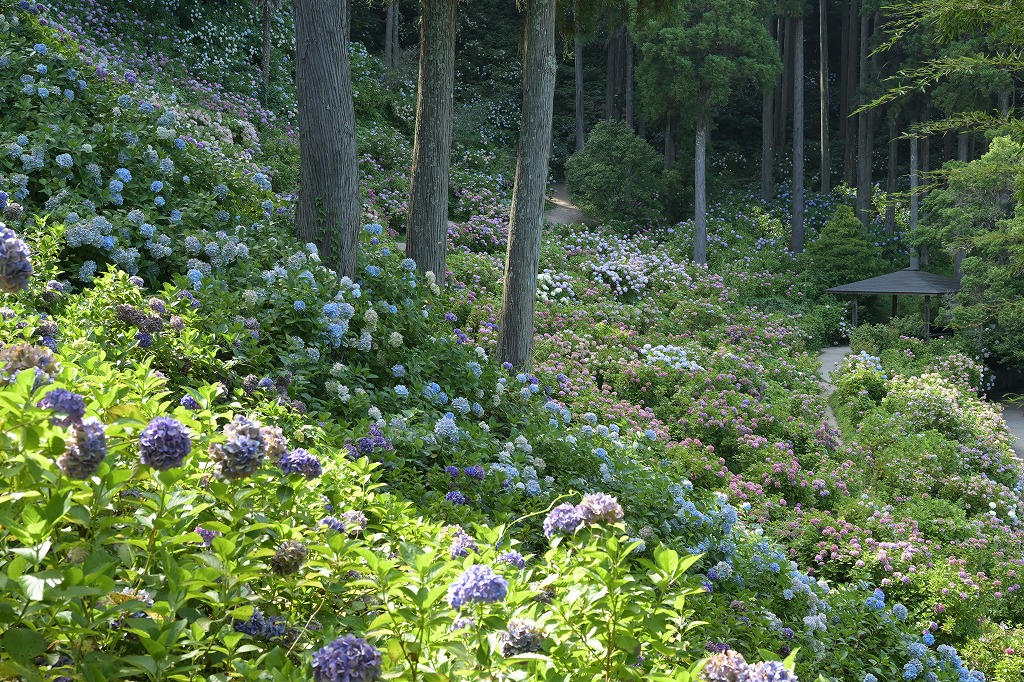 自宅の裏山斜面・約5,500坪の敷地に250種一万株以上のアジサイが咲き競ってました。