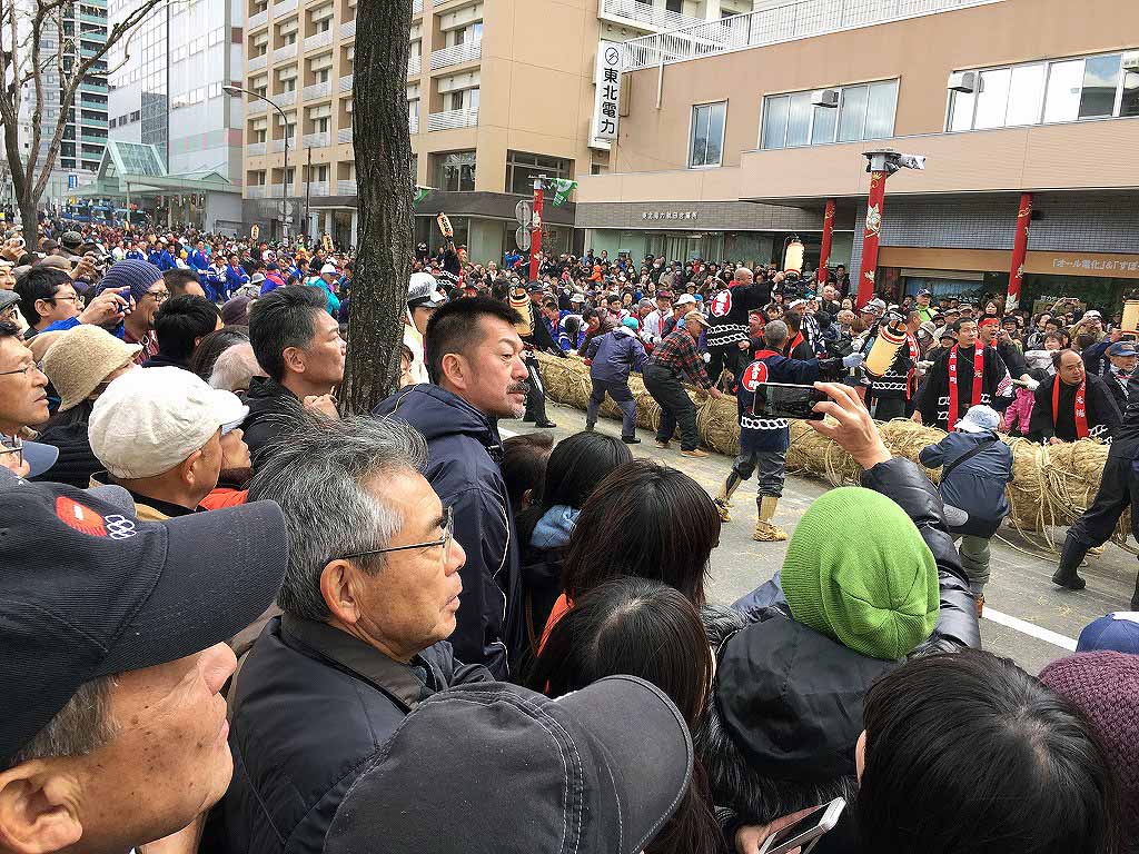 刈和野の大綱引きでは、建元役の俳優柳葉敏郎の合図で開始。上町(五日町)に秋工野球部員が、下町(二日町)にラグビー部員が分かれて引手をし、「ジョヤサ」「オイサー」と勇壮な掛け声を発しておりました。双方が一気に力を込め引き引手の苦しそうな顔に観衆から、「頑張れ」と掛け声が飛びました。
