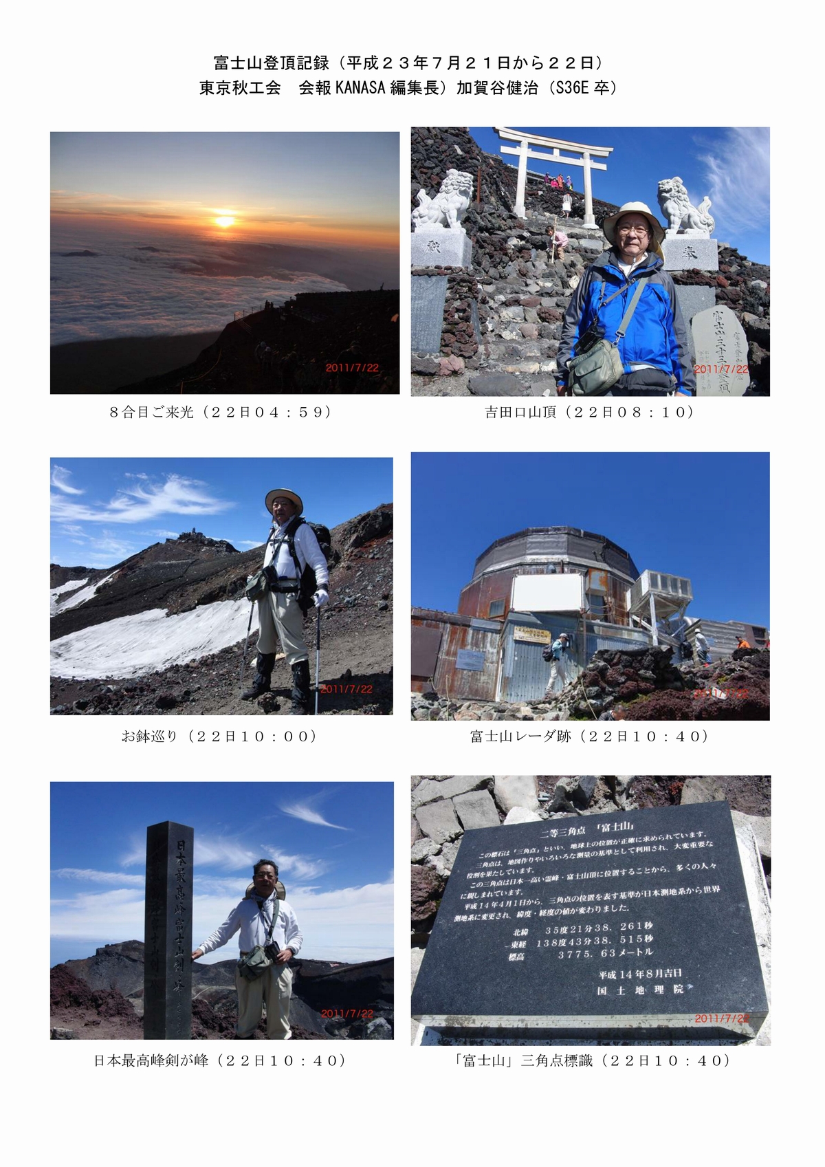東京秋工会役員の皆様へ 先の幹事会で、富士山登頂結果を皆様にご報告することにしておりましたので、 送付致します。 人生の記念になりました。皆様も元気なうちに1度は登頂したほうが良いと思います。 加賀谷