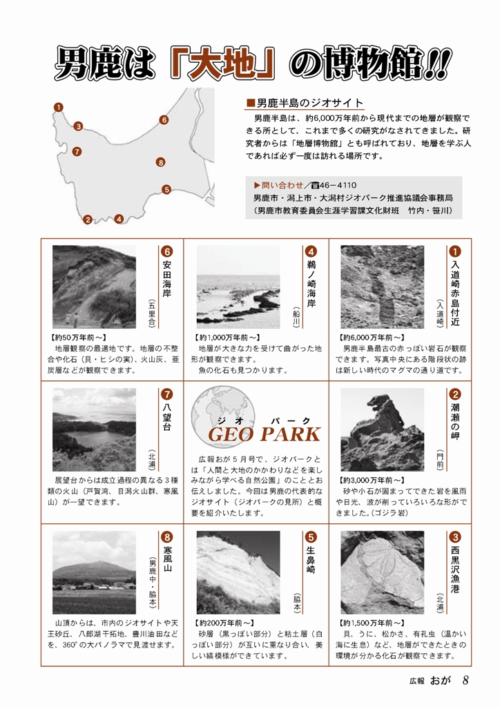 現在毎月1日刊行の『男鹿市広報」では、男鹿のジオサイト候補地を紹介しています。