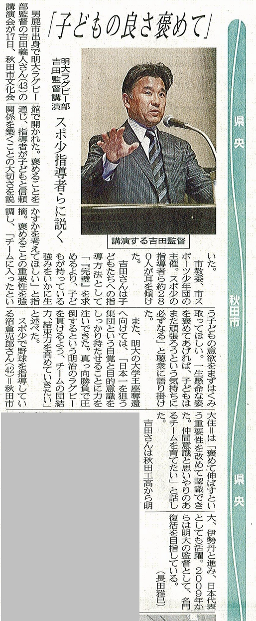 「 明治大学ラクビー部吉田監督講演 子供の良さ褒めて 秋田市文化会館 」 を ご紹介させていただきます。