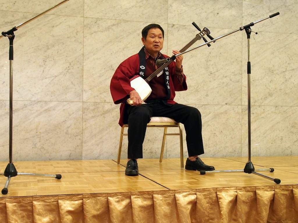 懇親会2部では、民謡 山形俊男氏、尺八 鈴木彦之氏 嵯峨良平氏、今回初参加の三味線 三浦晃氏による「長者の山」「生保内節」があり、三浦氏による津軽三味線の独奏がありました。
