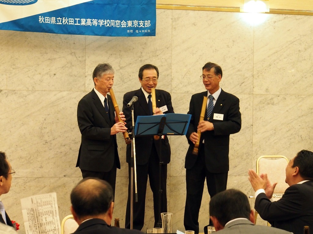 恒例となった、余興 器楽演奏では、ハーモニカ 高橋 陽之助(S31Y)、尺八 鈴木 彦之(S31M)、フルート 嵯峨 良平(S43E)のみなさんに今年初めて三平 俊悦氏(S39A)と嵯峨 良平氏の尺八が加わっての演奏となりました。