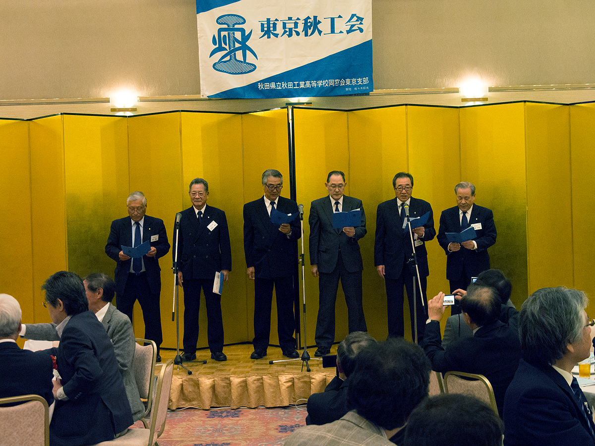 地主勝己副会長(S37C)による開会の辞に続き、嵯峨勝氏(S43M)の音頭で全員による校歌斉唱があり、秋工同窓会前会長 太田光重氏 及び東京秋工会会員で昨年度総会以降にご家族などからご逝去の連絡があった加藤勇一氏ほか7名の方々へ全員で一分間の黙祷を捧げました。