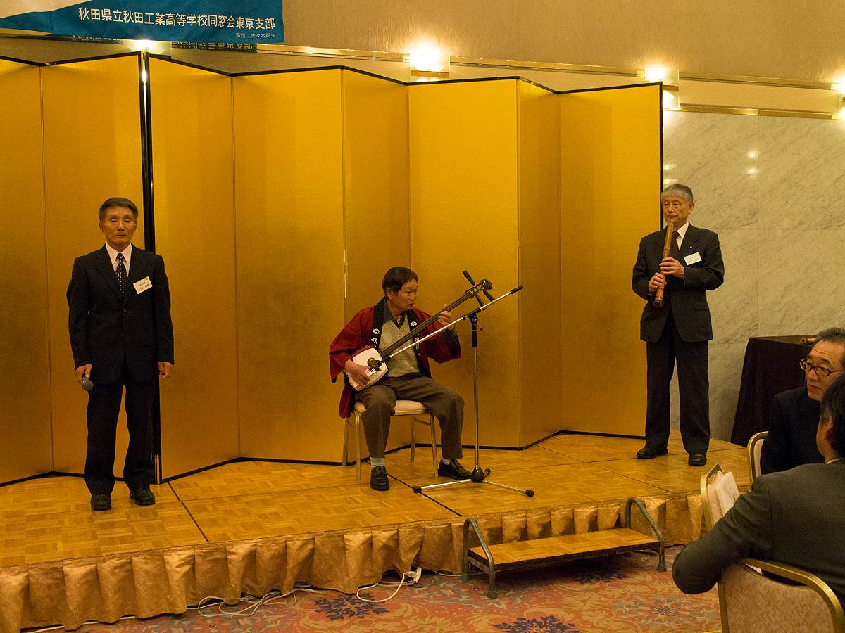 日本民謡協会主催の全国大会で優勝した民謡 山形俊男氏(S39M)、三味線 三浦晃氏(S37M)、尺八 鈴木彦之氏(S31M)、嵯峨良平氏(S43E)による「秋田酒屋唄」と、三浦氏の津軽三味線弾きがありました。