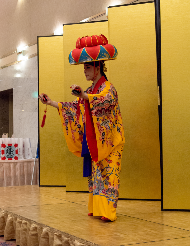 昨年と同じく佐々木幹事長の奥様喜久恵さんとお仲間による色鮮やかな琉球衣装をまとわれた喜扇本流の琉球舞踊「メンソーレ沖縄」「四ツ竹」がありました。